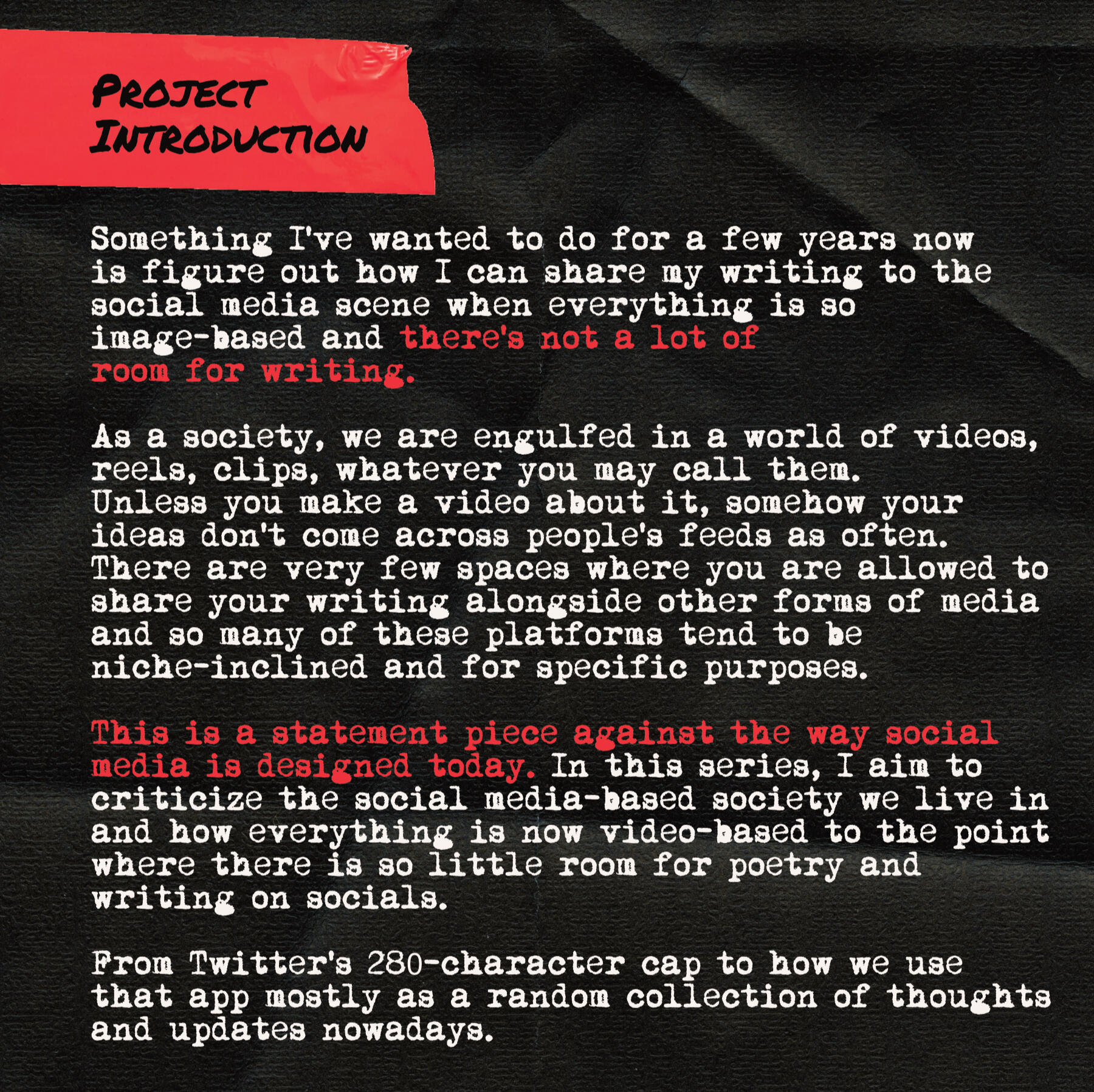One of the most human things is to want to be heard, but how can I be heard if there is no room for my voice, my writing? I am here to defy the limitations I’ve been given to work with. I am here to make more space.Something I’ve wanted to do for a few years now is figure out how I can share my writing to the social media scene when everything is so image-based and there’s not a lot of room for writing.As a society, we are engulfed in a world of videos, reels, clips, whatever you may call them. Unless you make a video about it, somehow your ideas don't come across people’s feeds as often. There are very few spaces where you are allowed to share your writing alongside other forms of media and so many of these platforms tend to be niche-inclined and for specific purposes.This is a statement piece against the way social media is designed today. In this series, I aim to criticize the social media-based society we live in and how everything is now video-based to the point where there is so little room for poetry and writing on socials.From Twitter’s 280-character cap to how we use that app mostly as a random collection of thoughts and updates nowadays. We are no longer calling Twitter “X”, not because we aren't used to the name change, but because we have no respect for the platform anymore. How Instagram’s photo and reel features are limited, capping a post at 2,200 characters. Instagram’s secondary app, Threads, is essentially a makeshift Twitter at this point. Tumblr is one of the few spaces still designed for readers and writers, and how limitless this platform alone can be, and we use all of these apps to show only the good moments we have stored in our photos.This is about how we move away from literature so fast these days that we’re losing vocabulary and grammar and substituting it with lingo and slang instead. Schools aren’t teaching proper grammar in American educational systems anymore because of social media. Bookstores are mostly empty when you arrive at their destination, and Barnes and Noble are switching between playing defense and offense with bankruptcy because of Amazon.Download an app to speak your mind. What if I don't want to do that? What if I don't want my story to disappear within the next 24 hours, something more permanent, more pronounced? Make more space for me to write, please.The point of this project is to make writing seen in a digital world not meant for it with the platforms we've been given to work with. What about the writers and the multimedia artists?This is a "